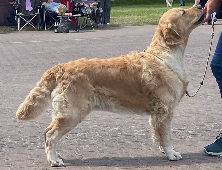 Typvolle sanfte Hündin, zunehmend freundlich, anatomisch korrekt, leicht welliges Haar mit guter Unterwolle, schöner Kopf, gut angesetzter Hals, tadellos im Stand, flüssiges Gangwerk.